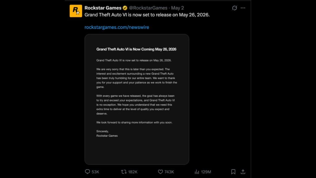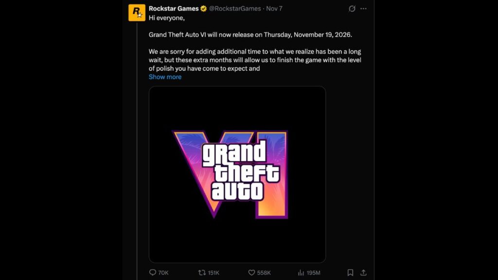 Rockstar thanked fans for their patience and support, expressing excitement for players to experience the sprawling state of Leonida and a return to modern-day Vice City. The November 19, 2026 release date is now the official target, though some fans remain skeptical given the game's history of delays.
